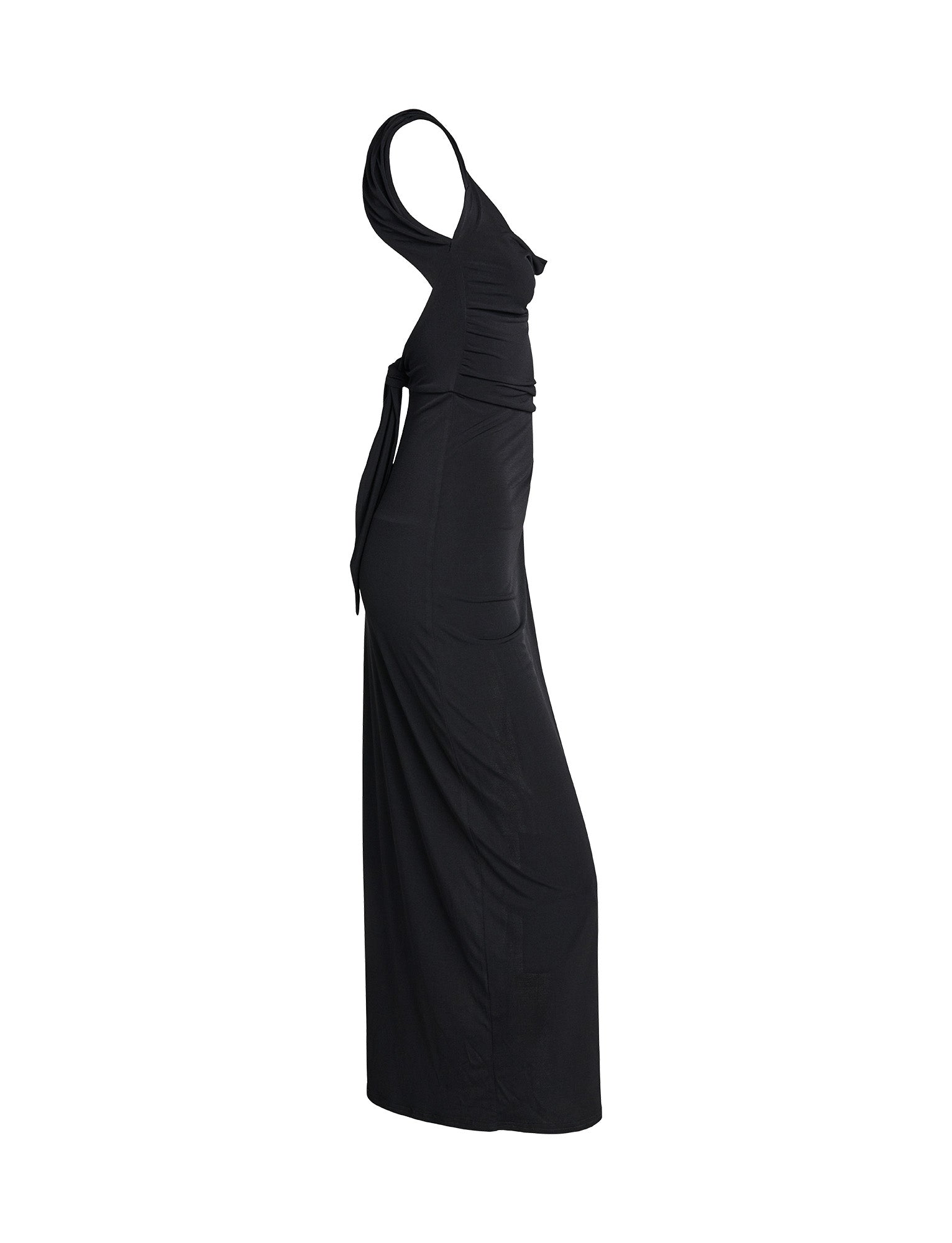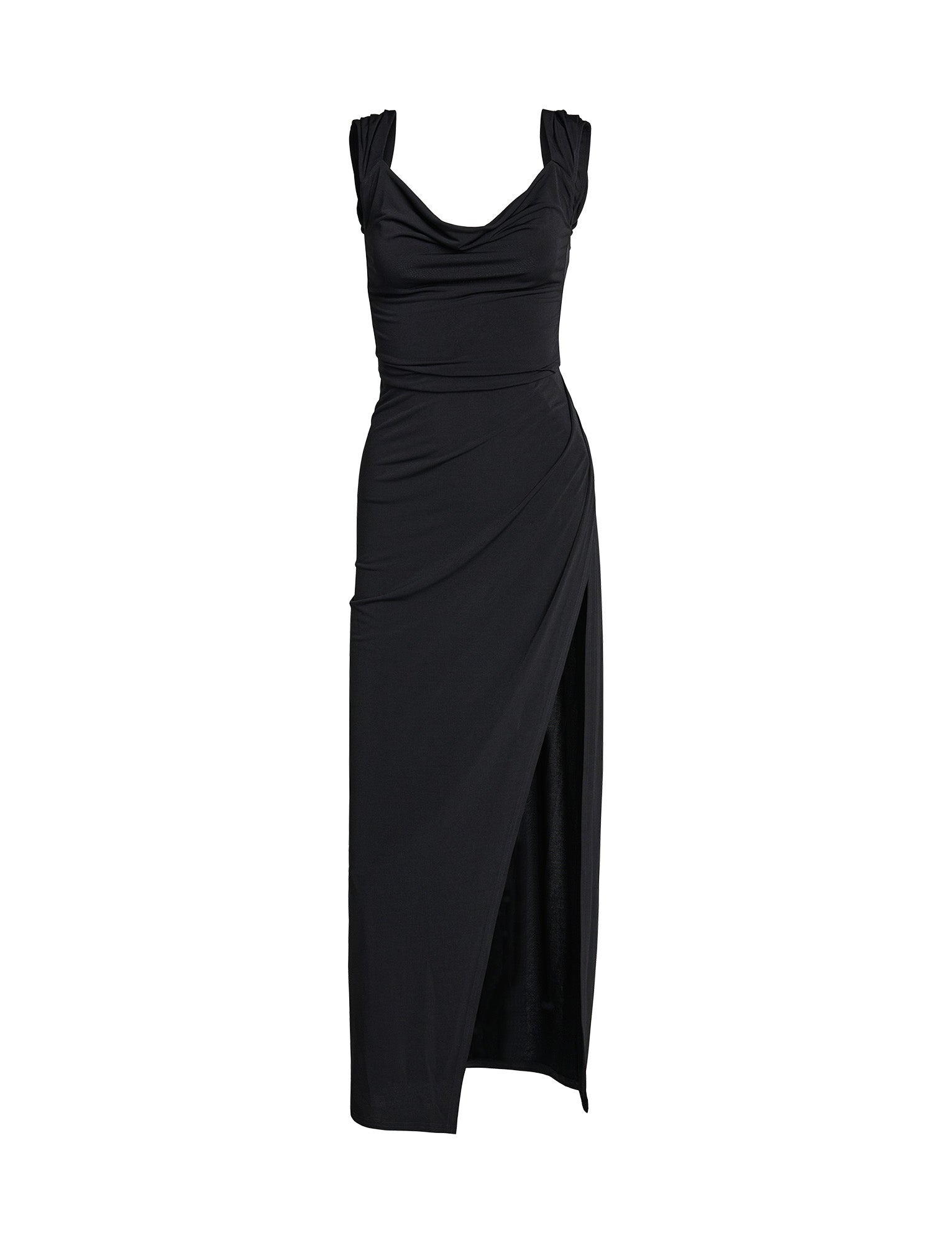 • Thigh-high split with cross-over feature - Angled side split with tucks at the seam on the left hem