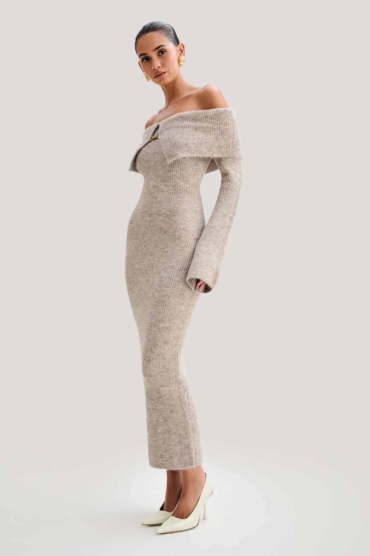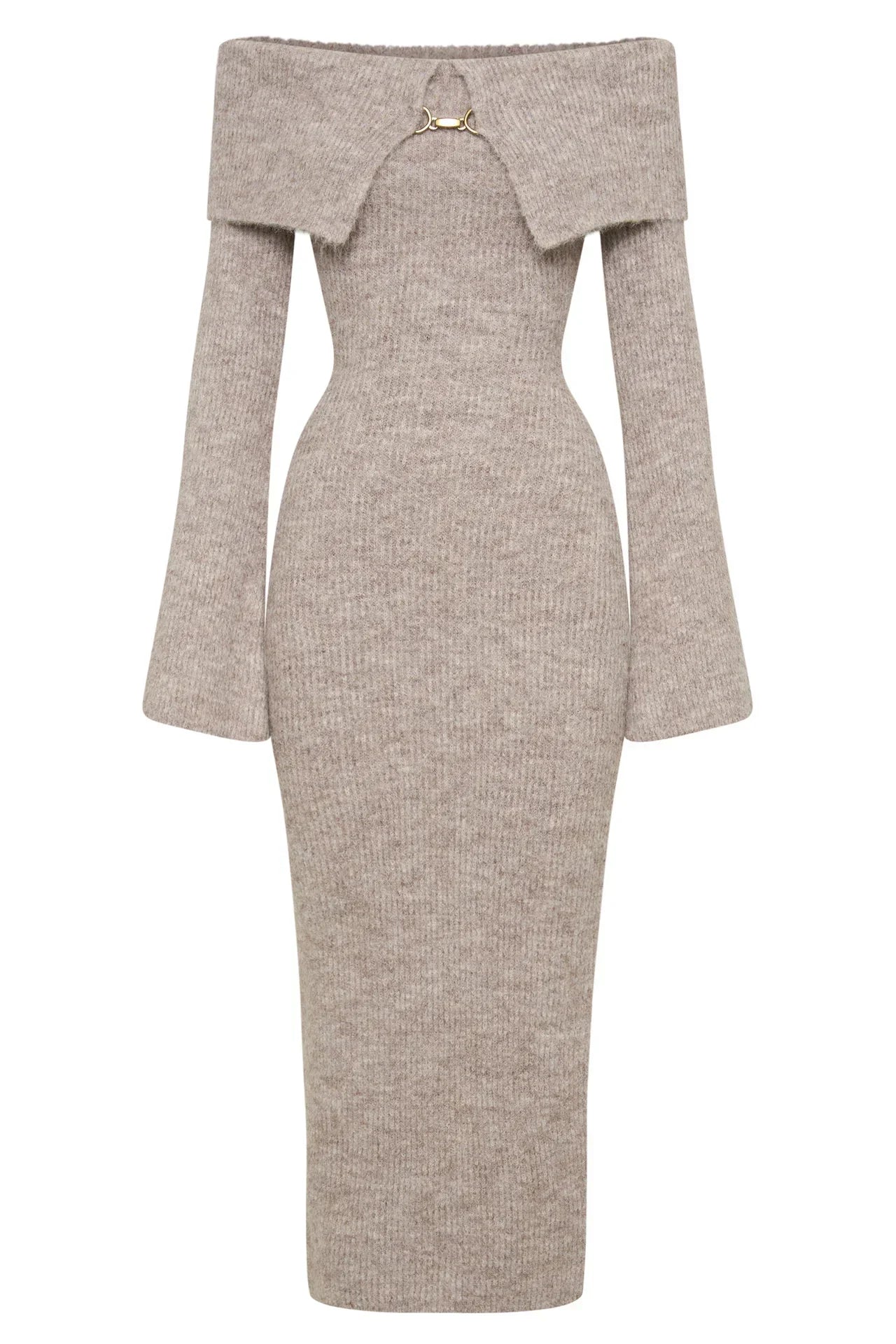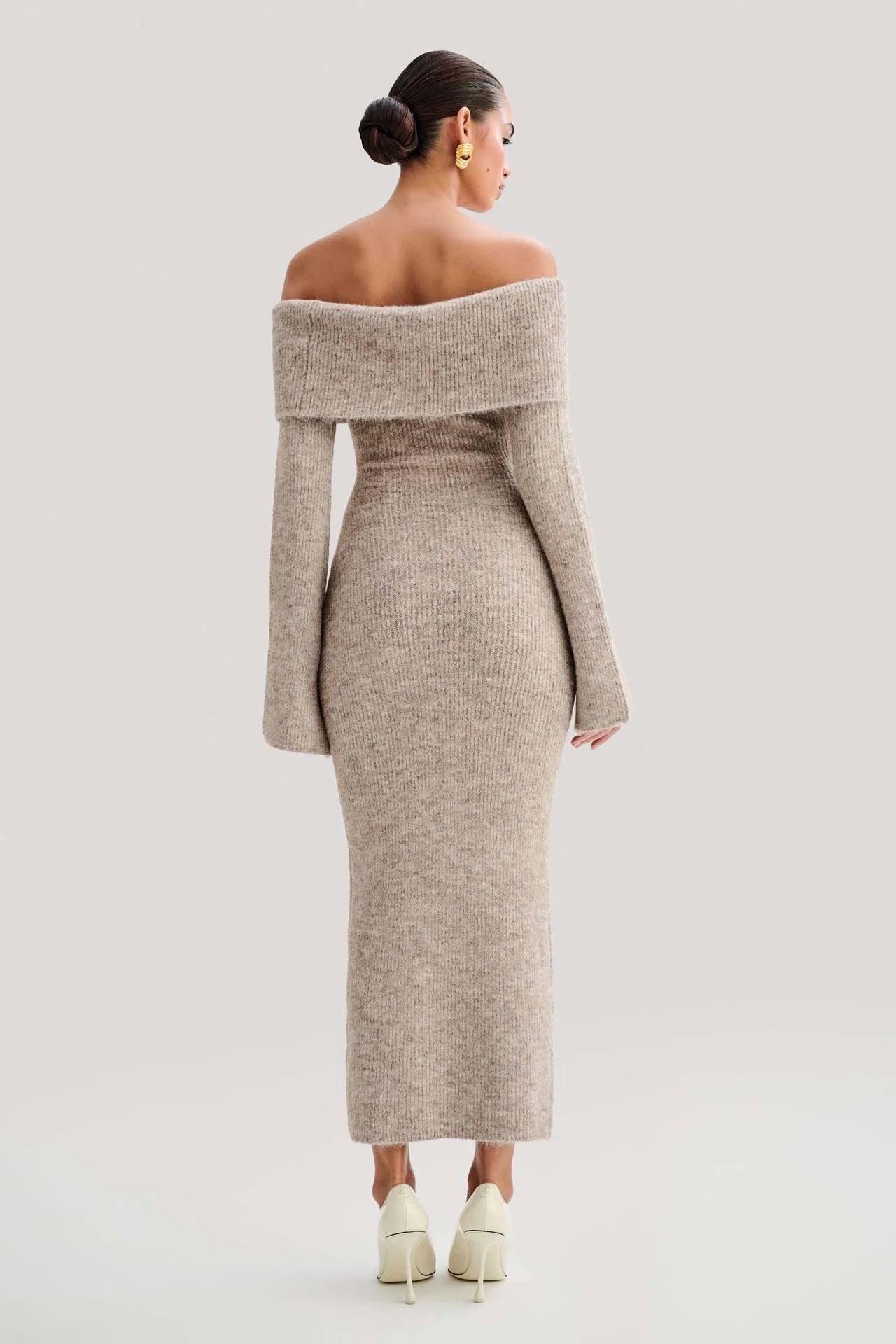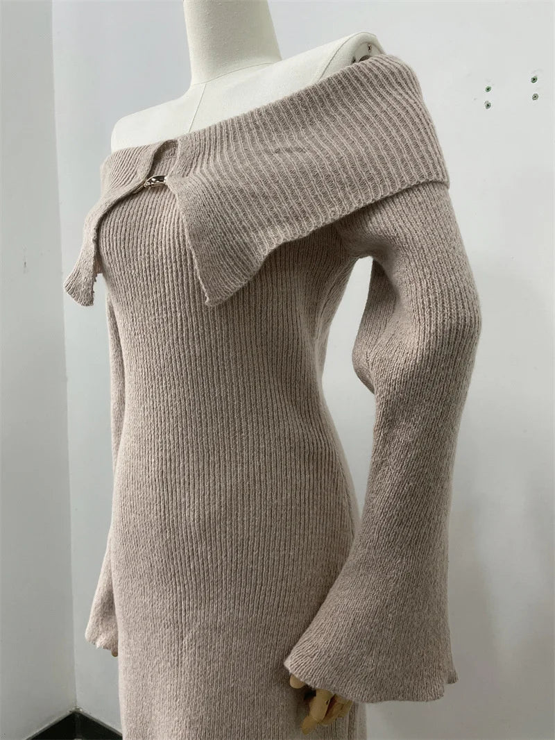 Fluffy Solid Knitted Off Shoulder Midi Dress