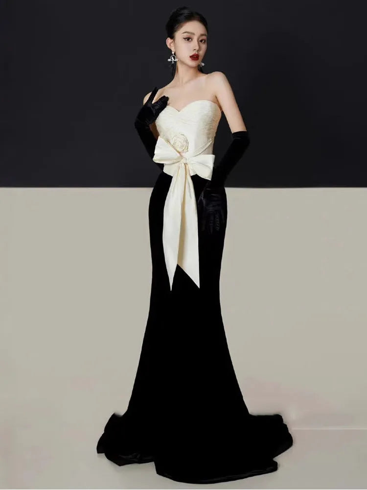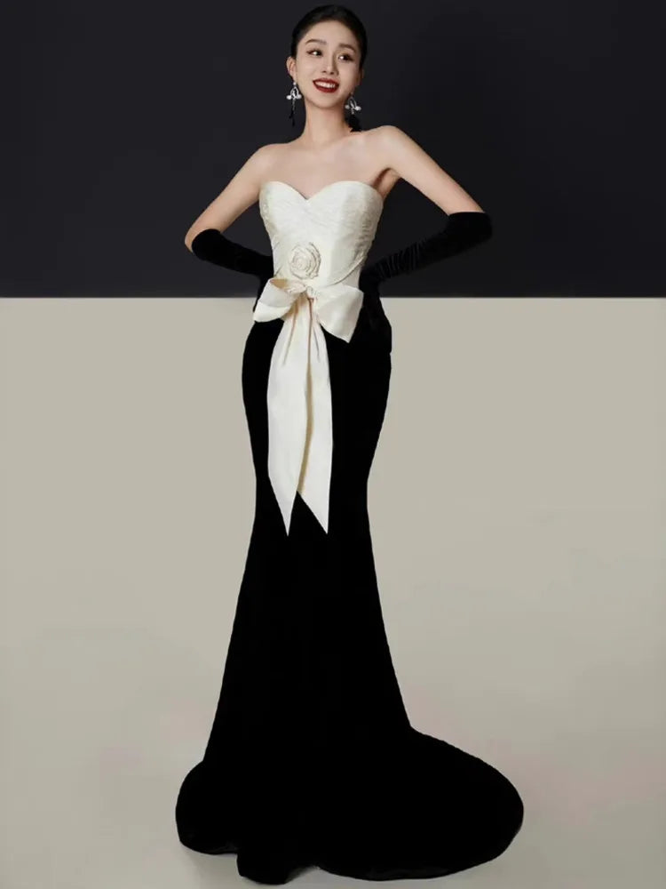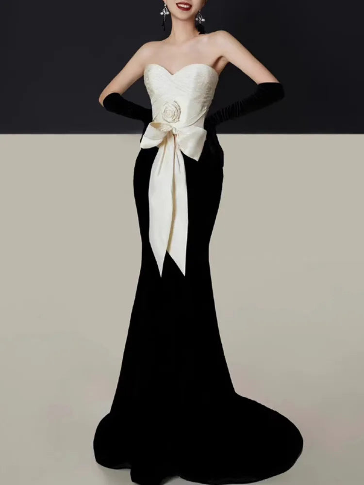 3D Flower Bowknot Patchwork Velvet Dress