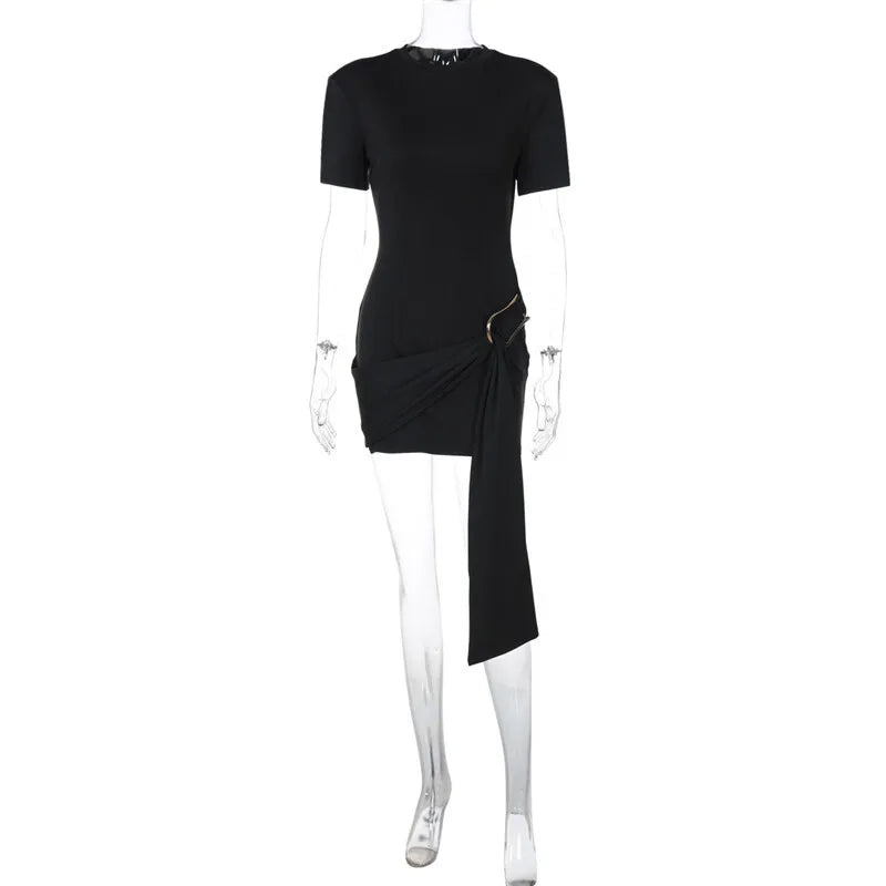 Short Sleeve Draped Black Metal Buckle Mini Dress