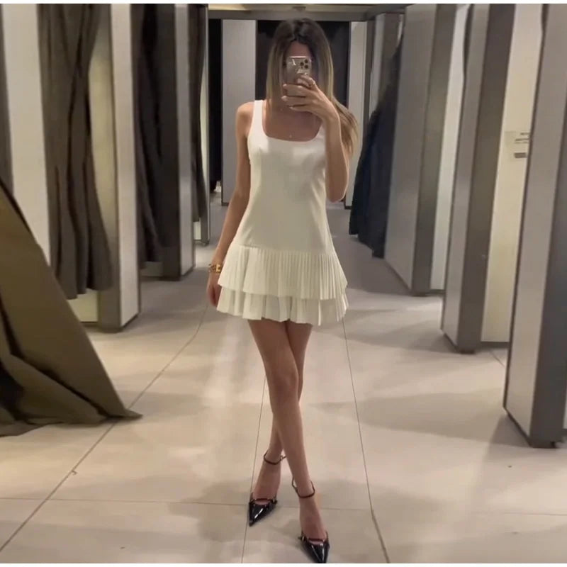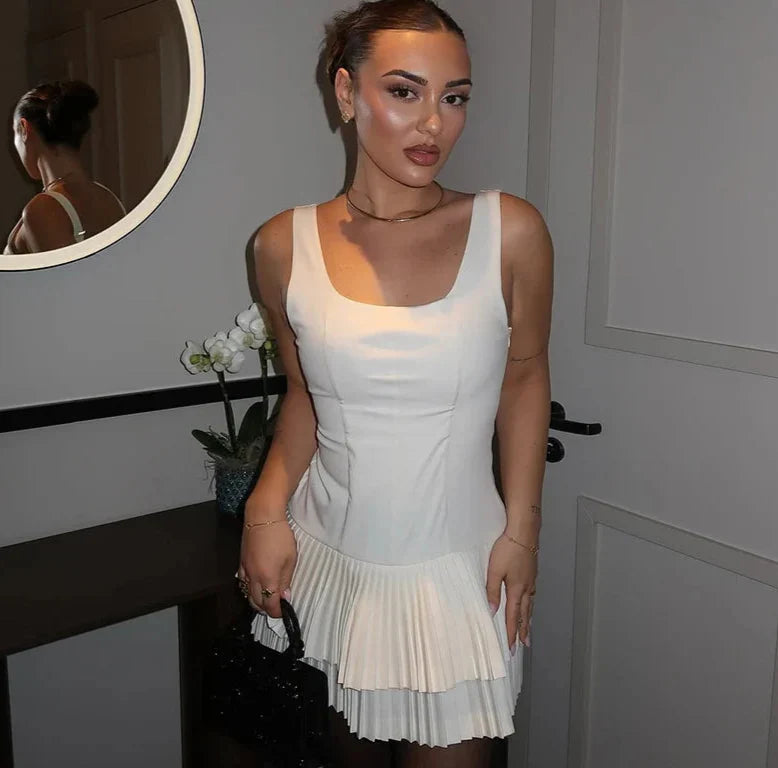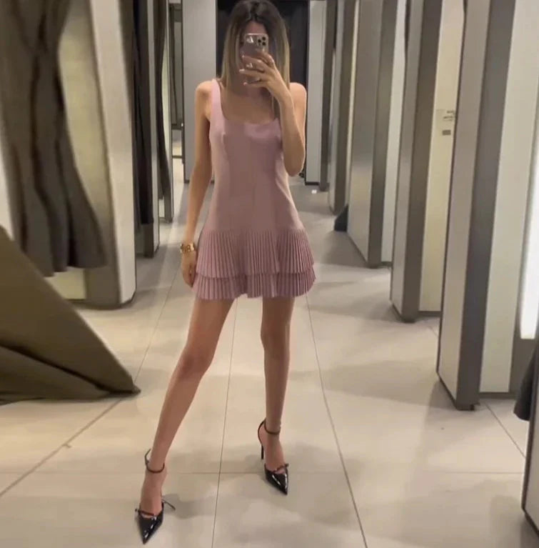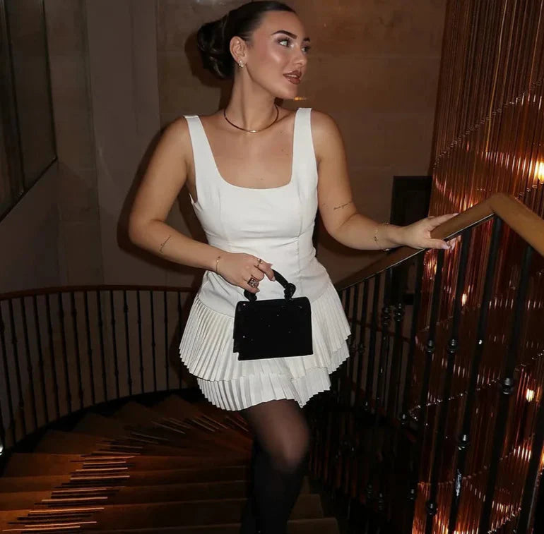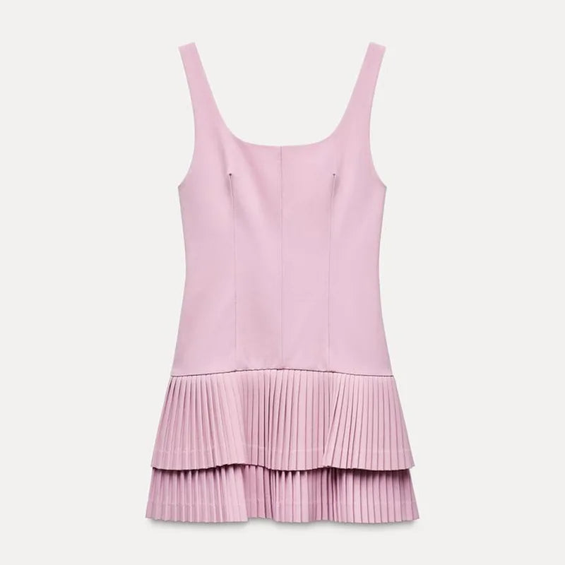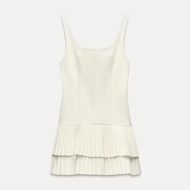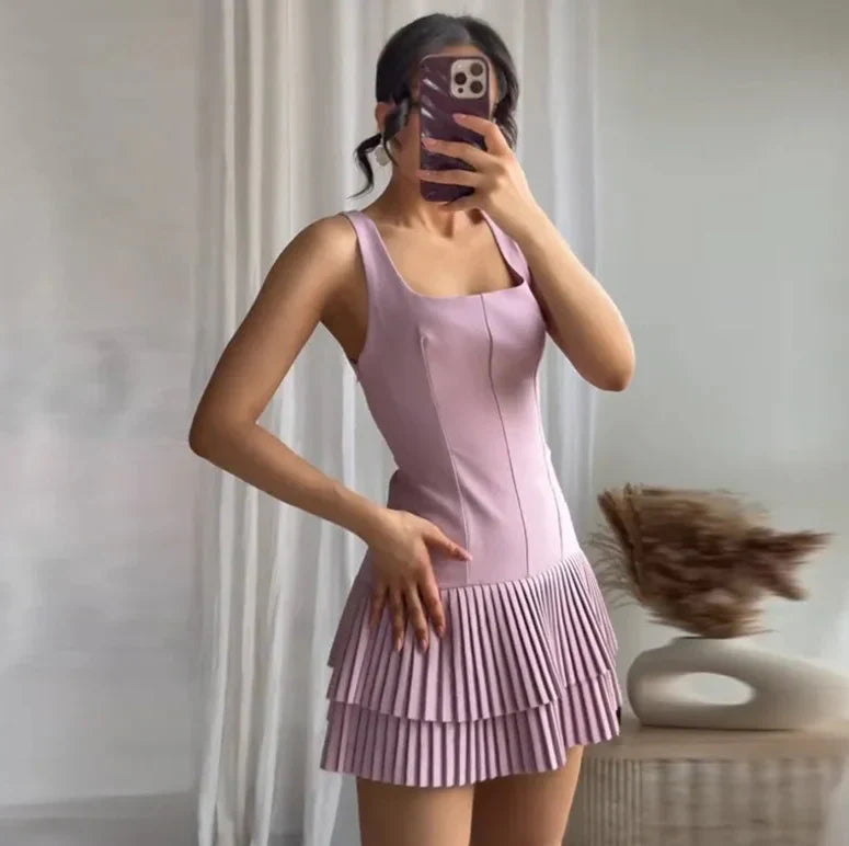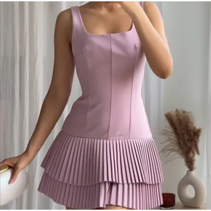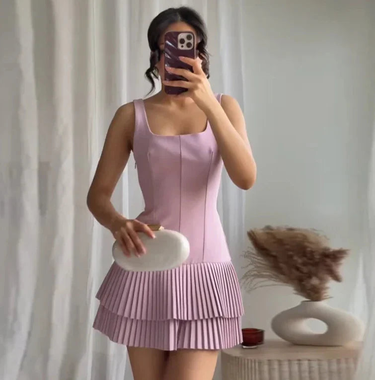 Square Collar Sleeveless Pleated Short Dress