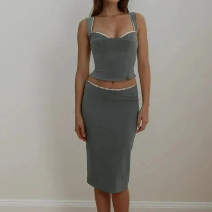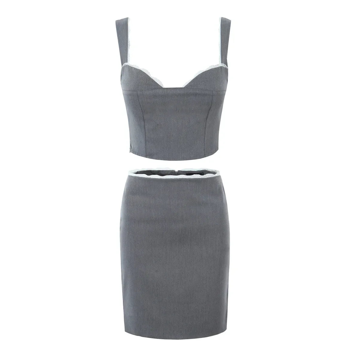 Spliced Lace Top Low Waist Midi Skirt Suits