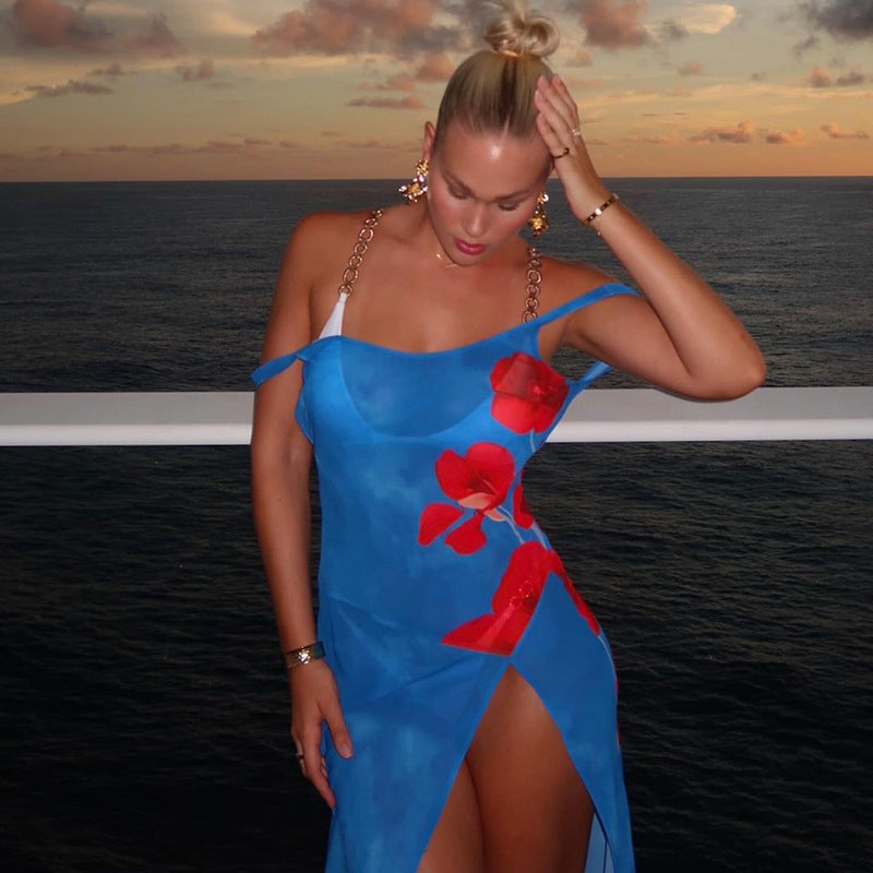 Big Backless Printed Dress Split Slimming Maxi Dress for