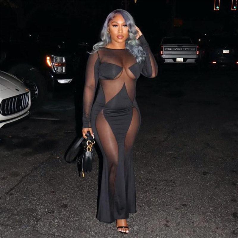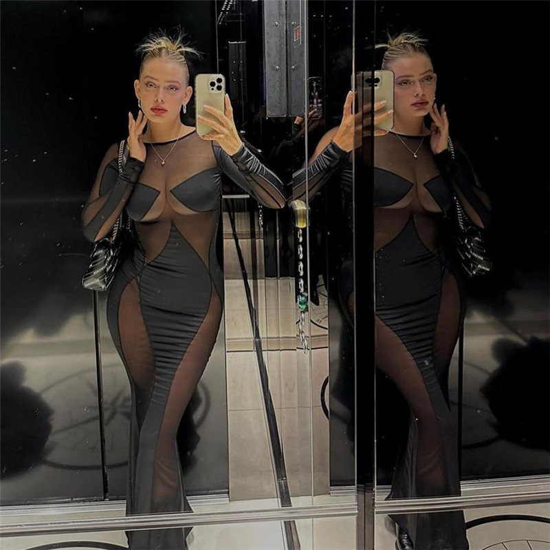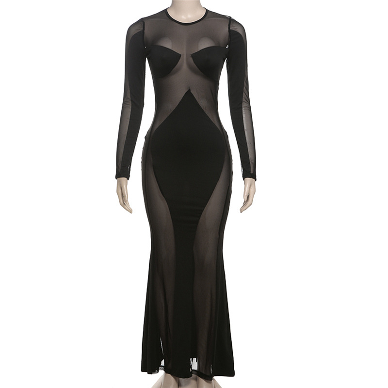 Stitching Mesh See through Maxi Dress Slim Dress