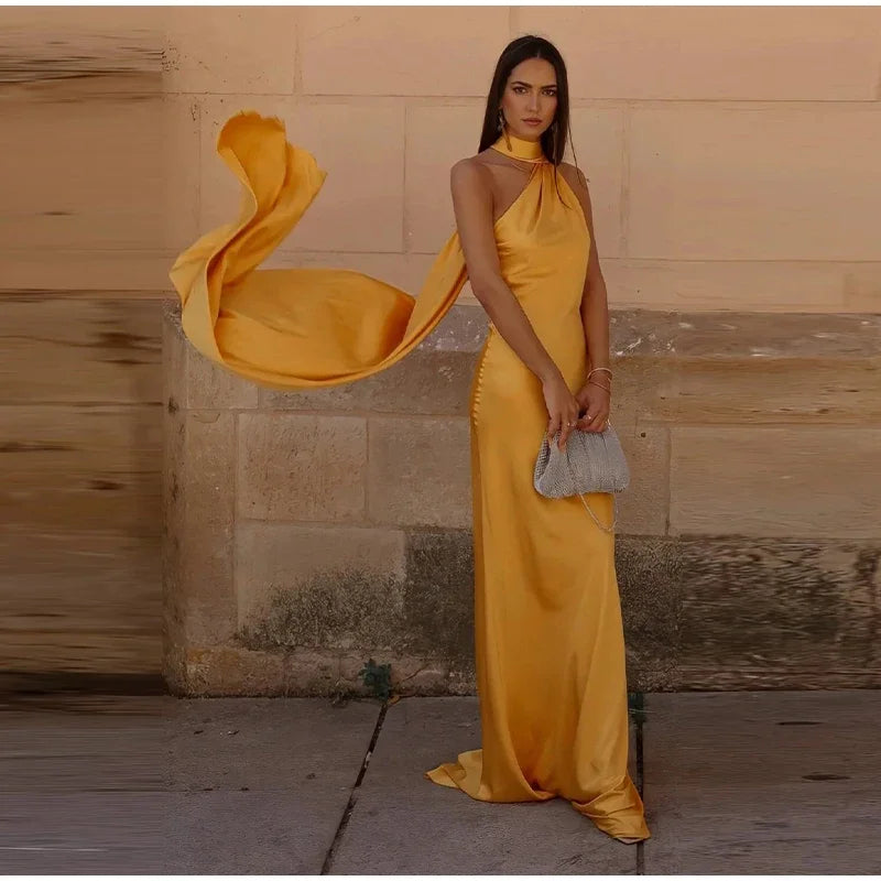 Yellow Satin Backless Lace-Up Off-Shoulder Maxi Dress