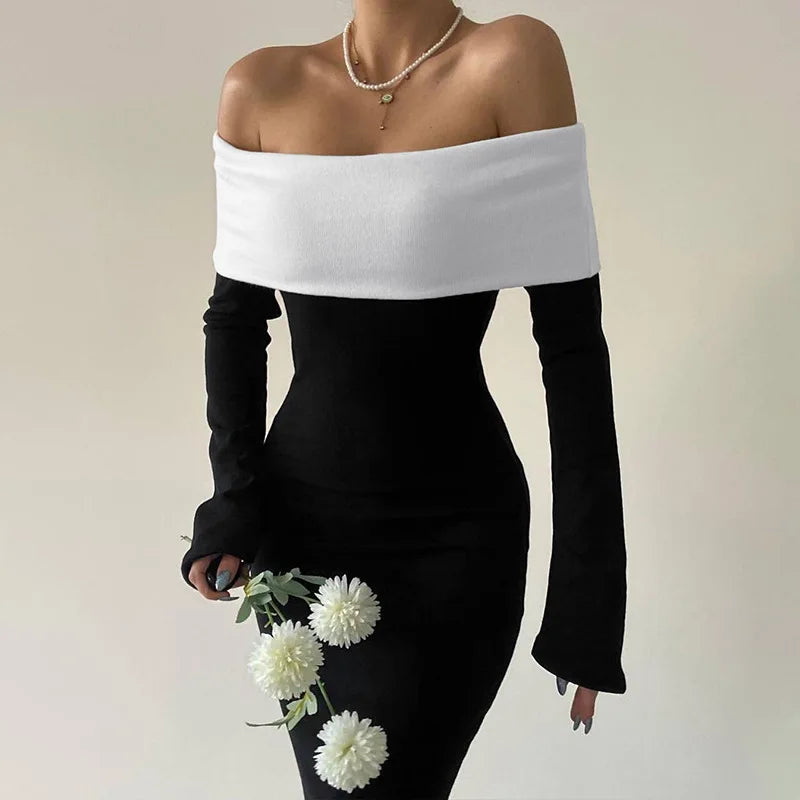 Black & White Off-the-Shoulder Maxi Dress with Long Sleeves