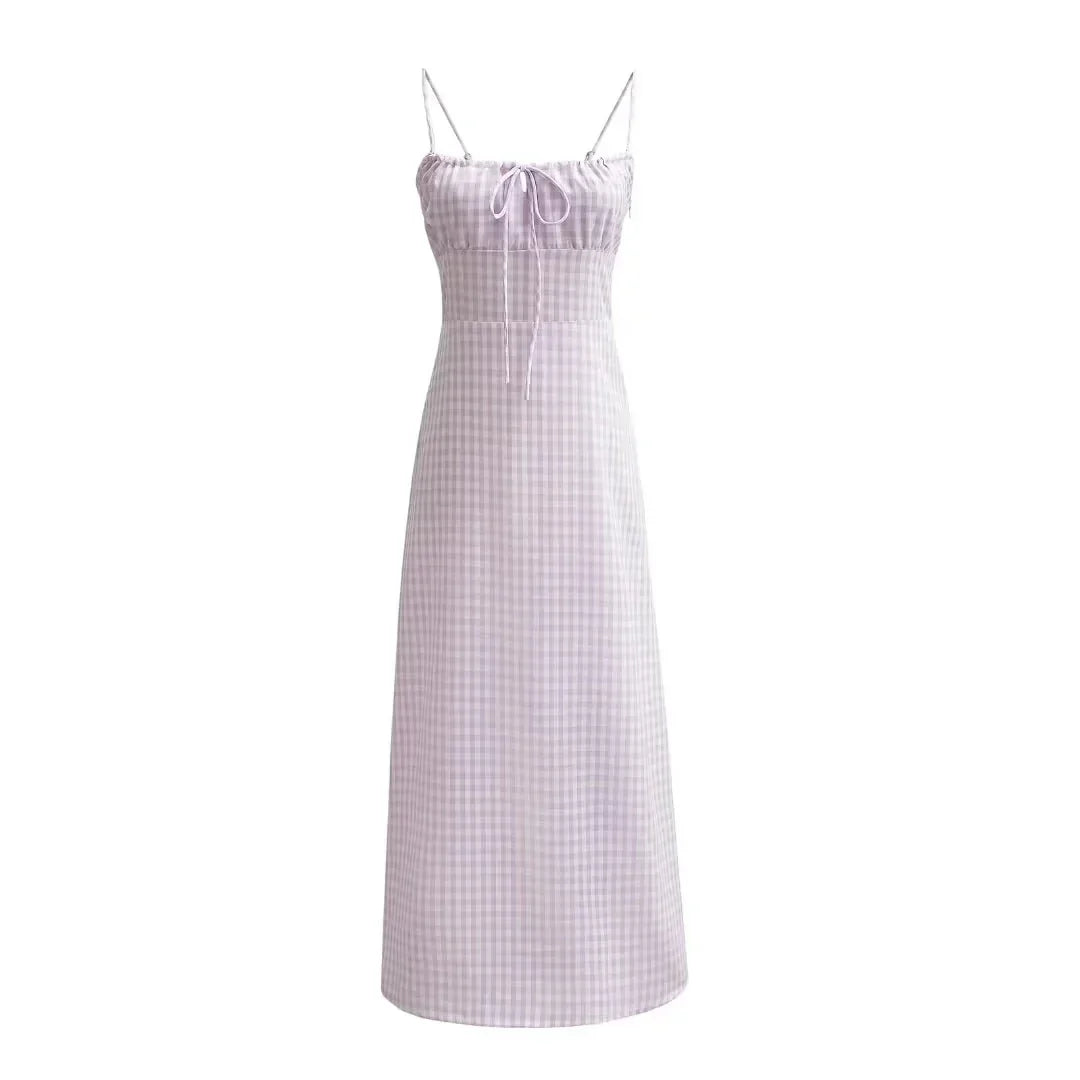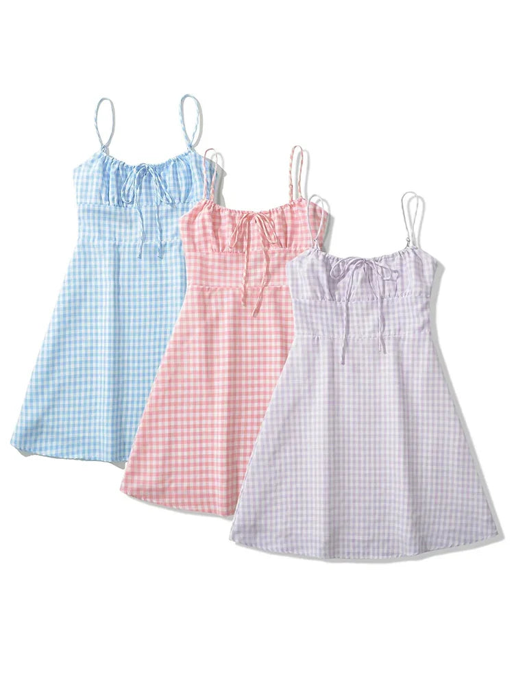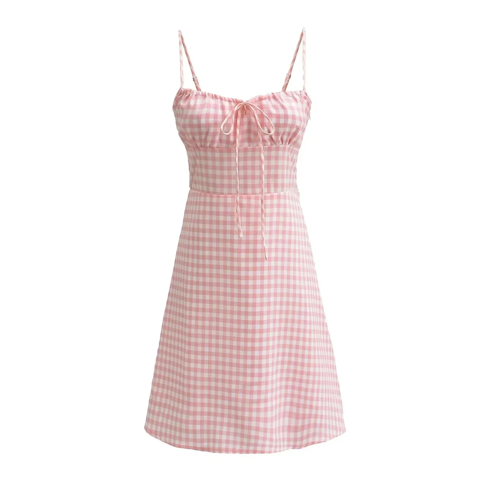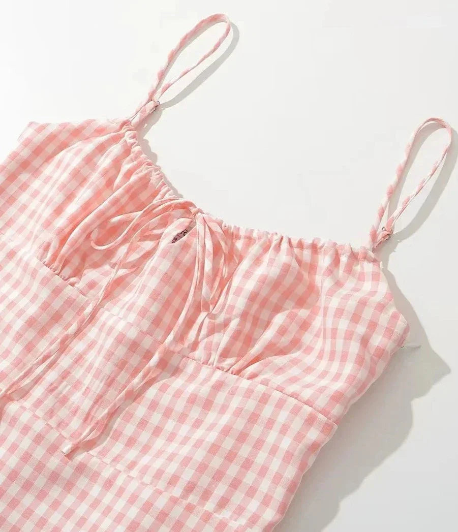 Spaghetti Strap Tie Up Plaid Pink Midi Dress