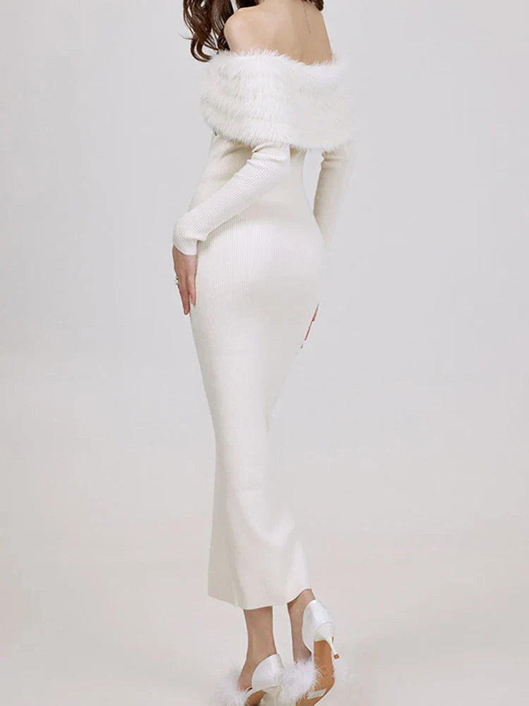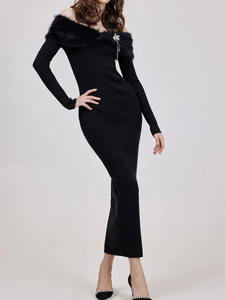 Patchwork Fur Collar Slash Neck Diamond Dress