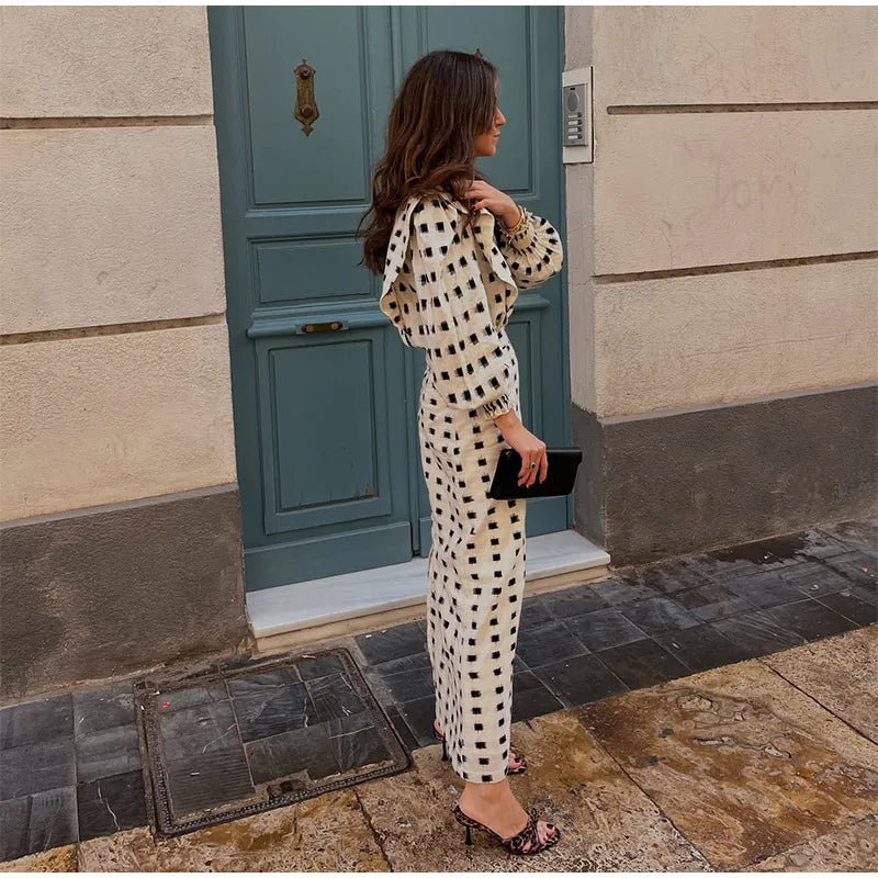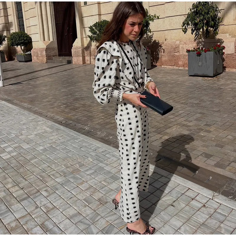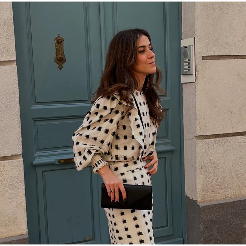 Plaid Puff Sleeve Long Skirt Suit Fashion Ruffles