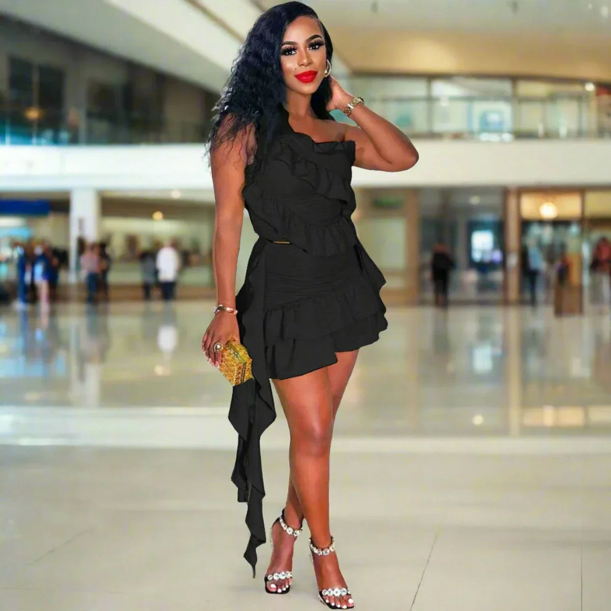 Ruffles Ribbons One Shoulder Top Mini Skirts Suits
