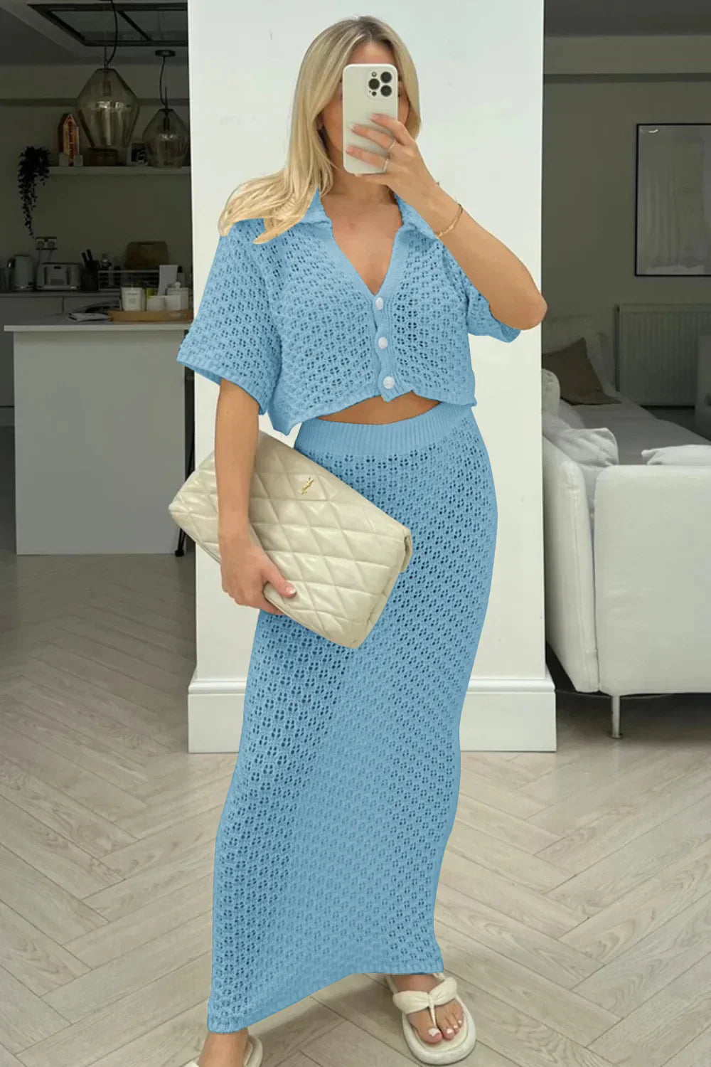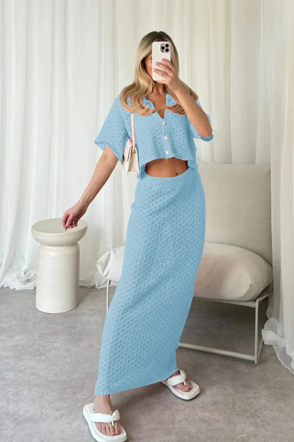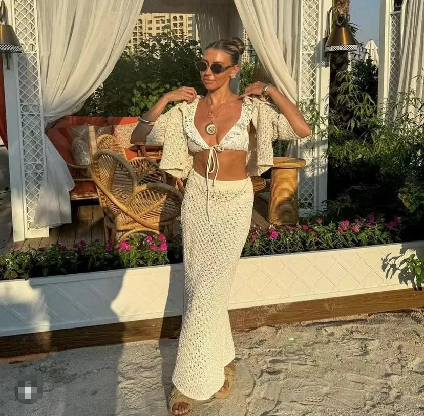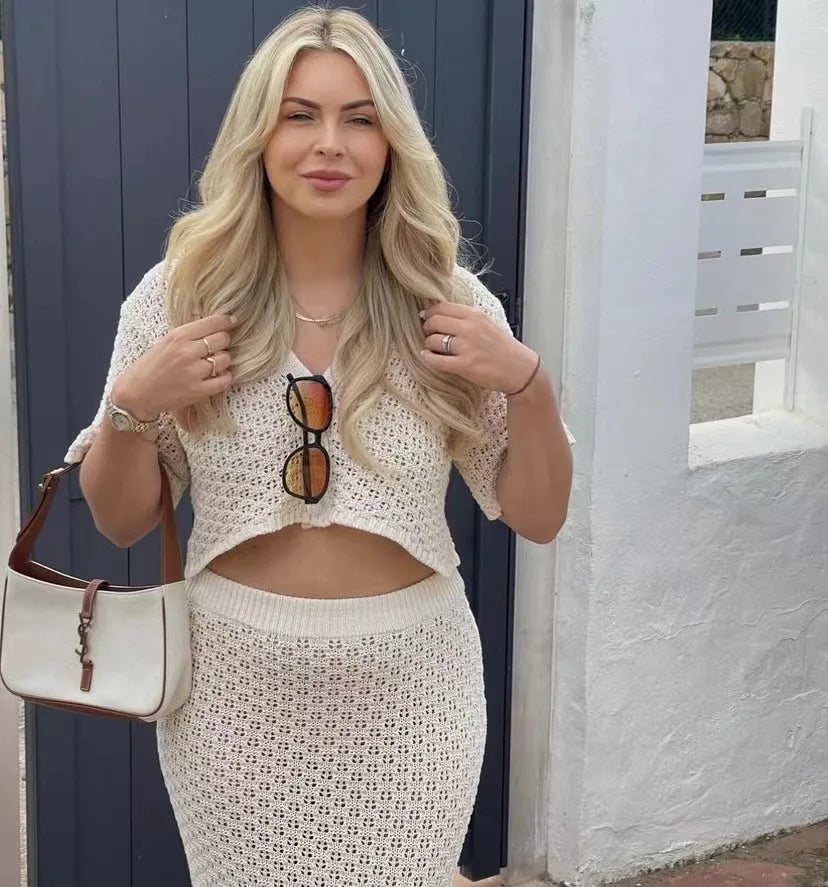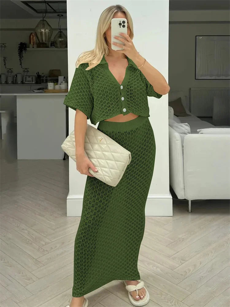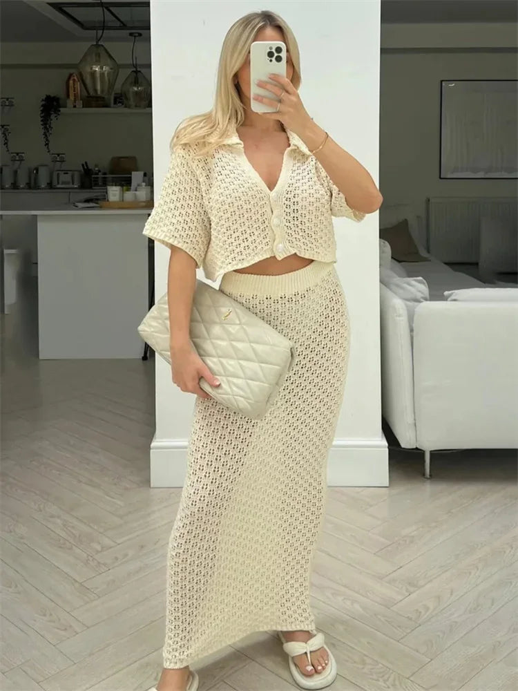 Knit Hollow Out Top and Long Skirt Suit