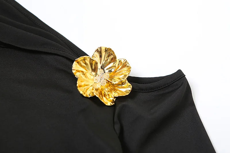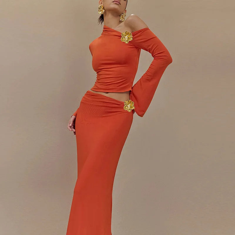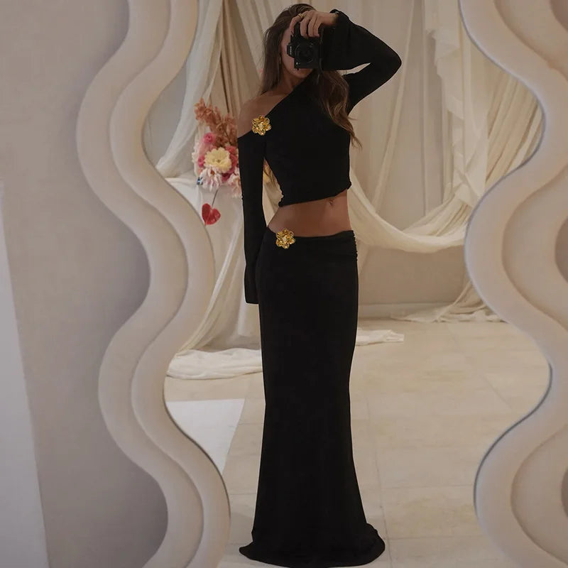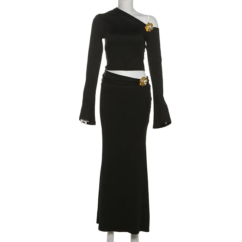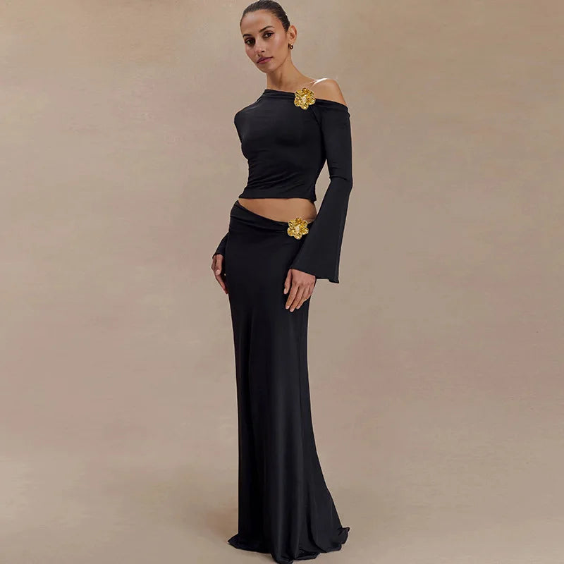 3D Floral-applique Long Sleeve Skirt Suit