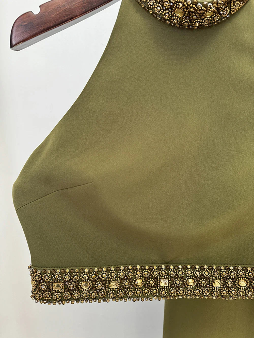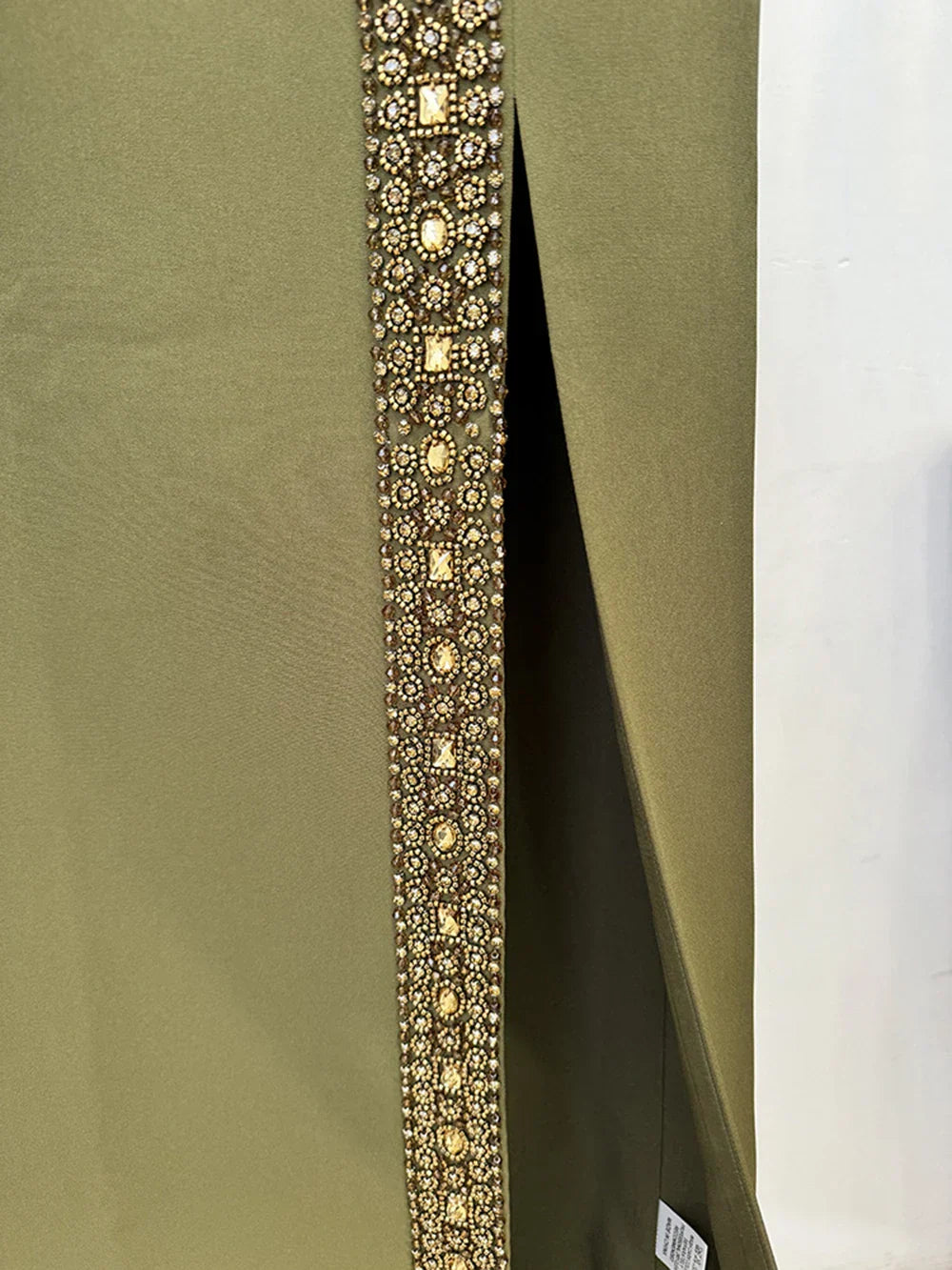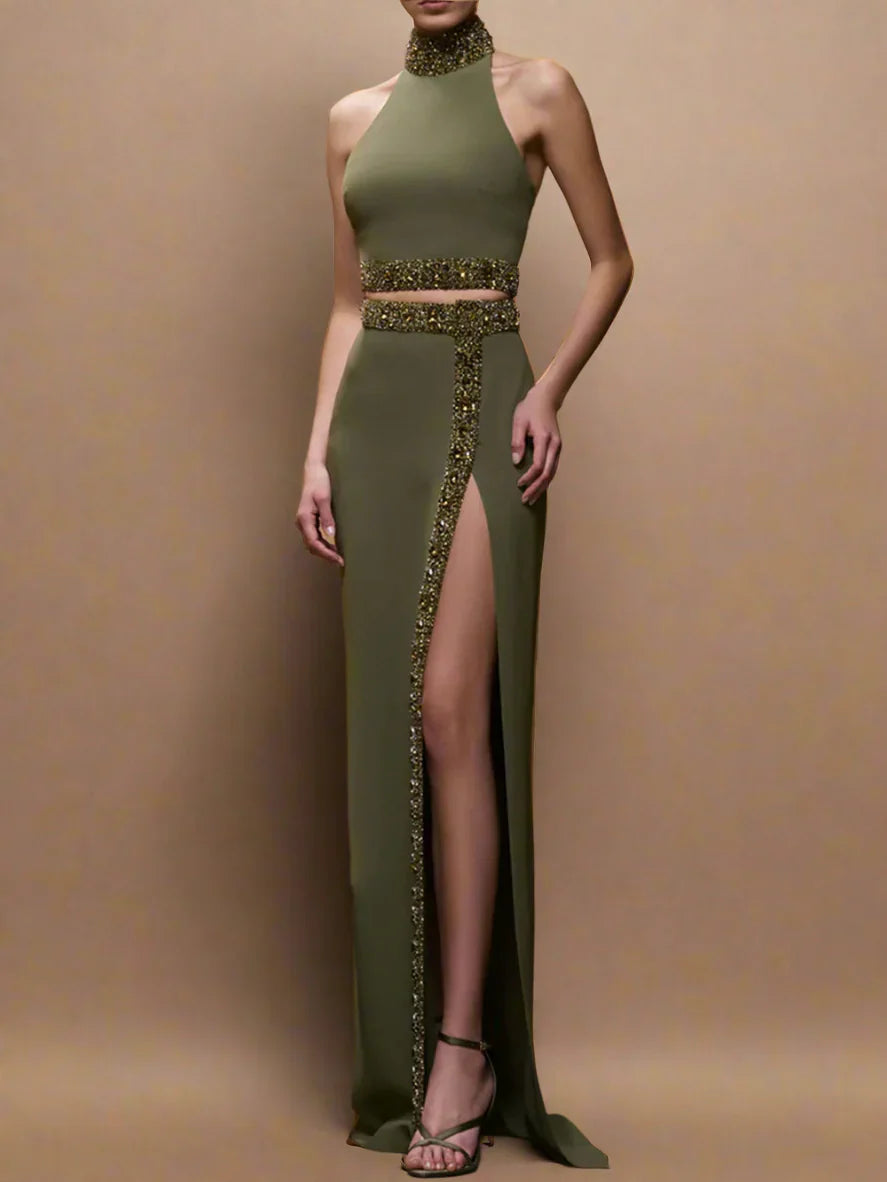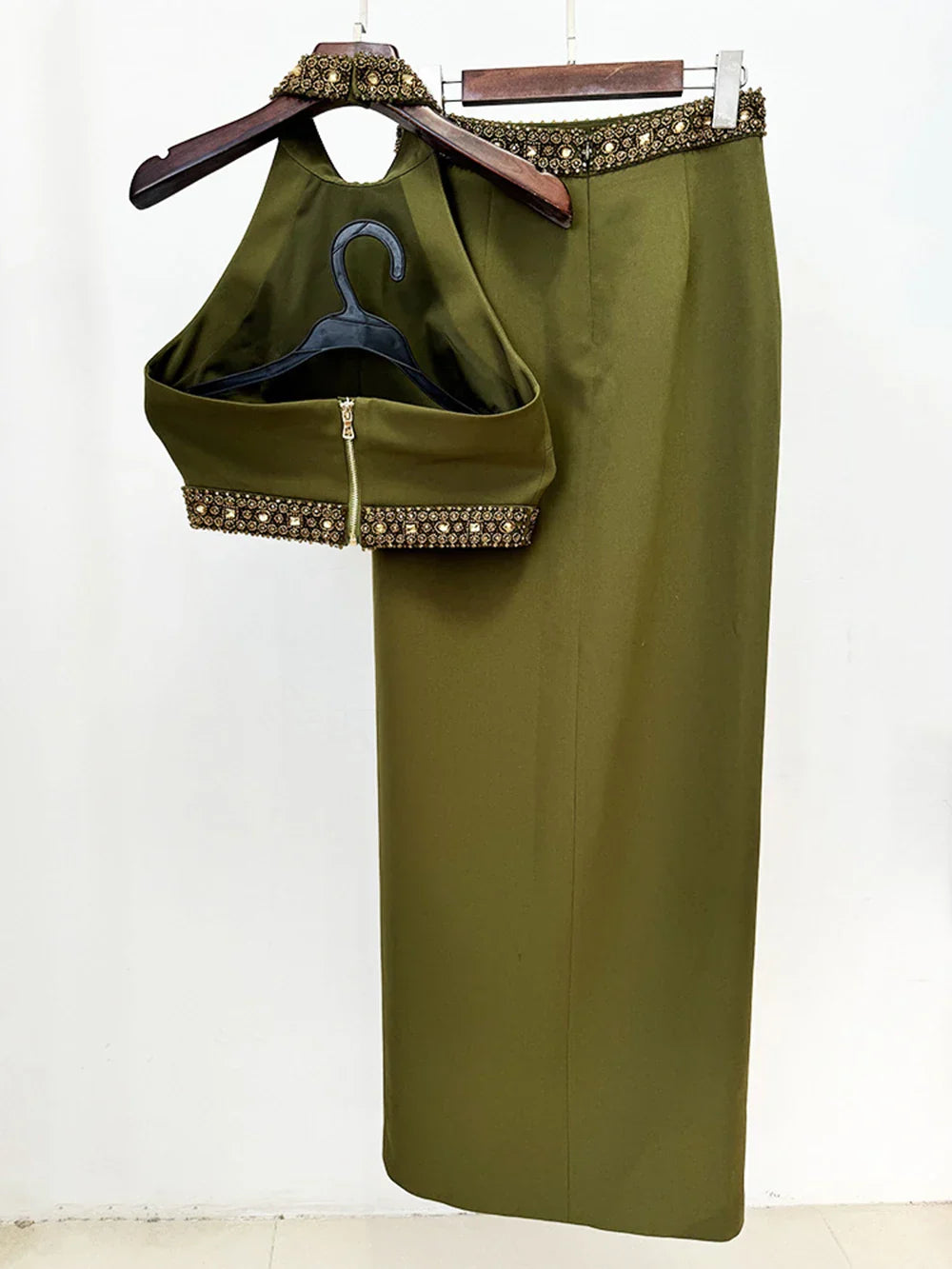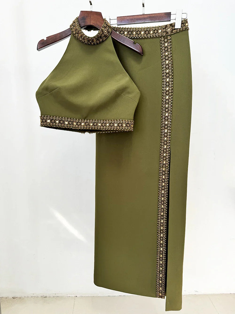 Beaded Diamond Two-Piece Crop Top Split Skirt Set
