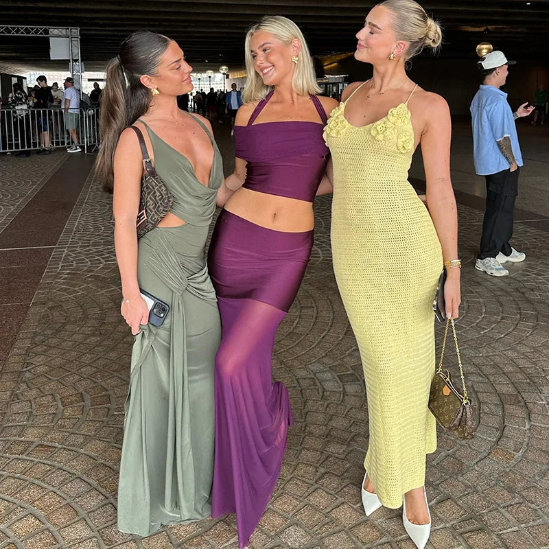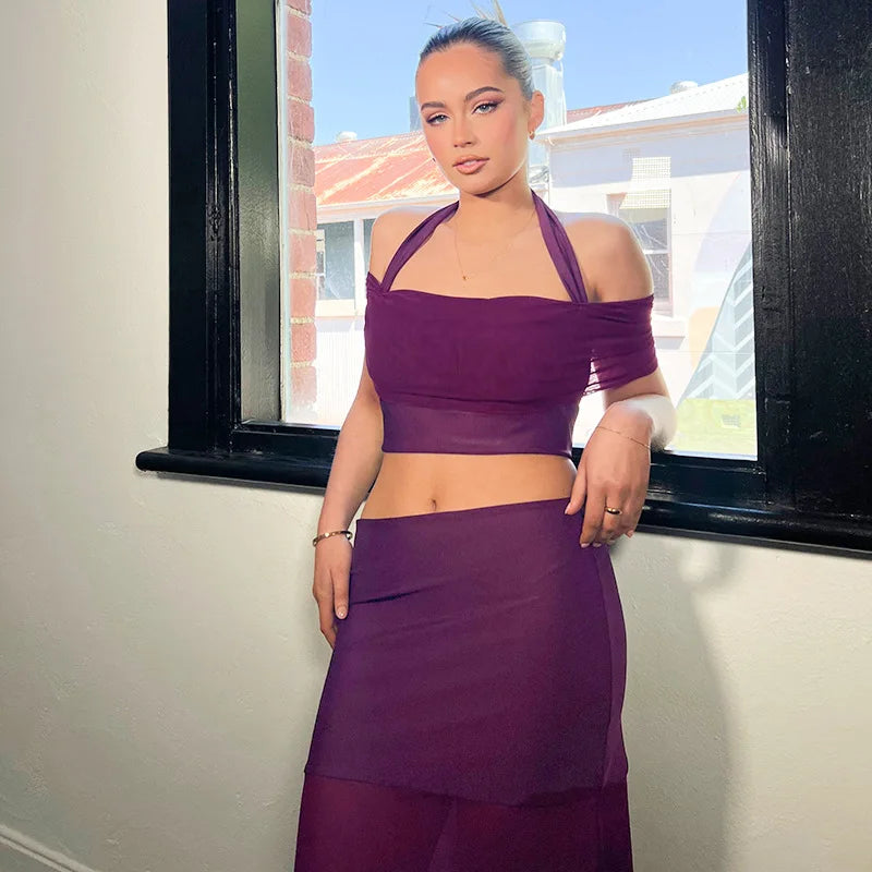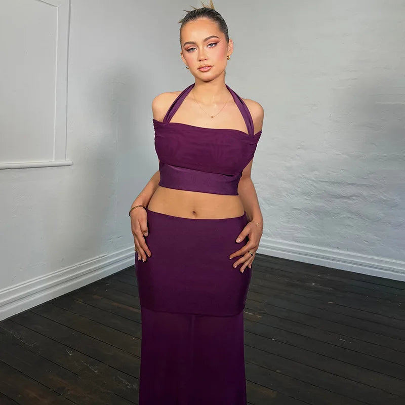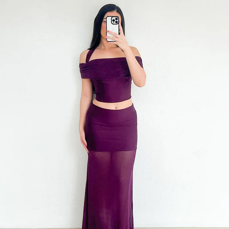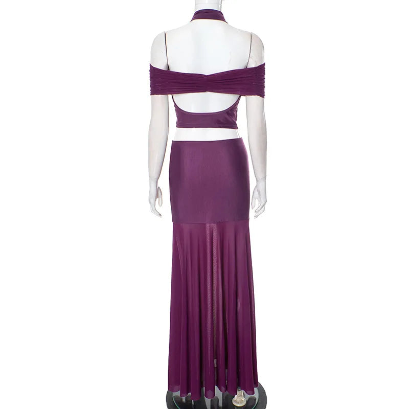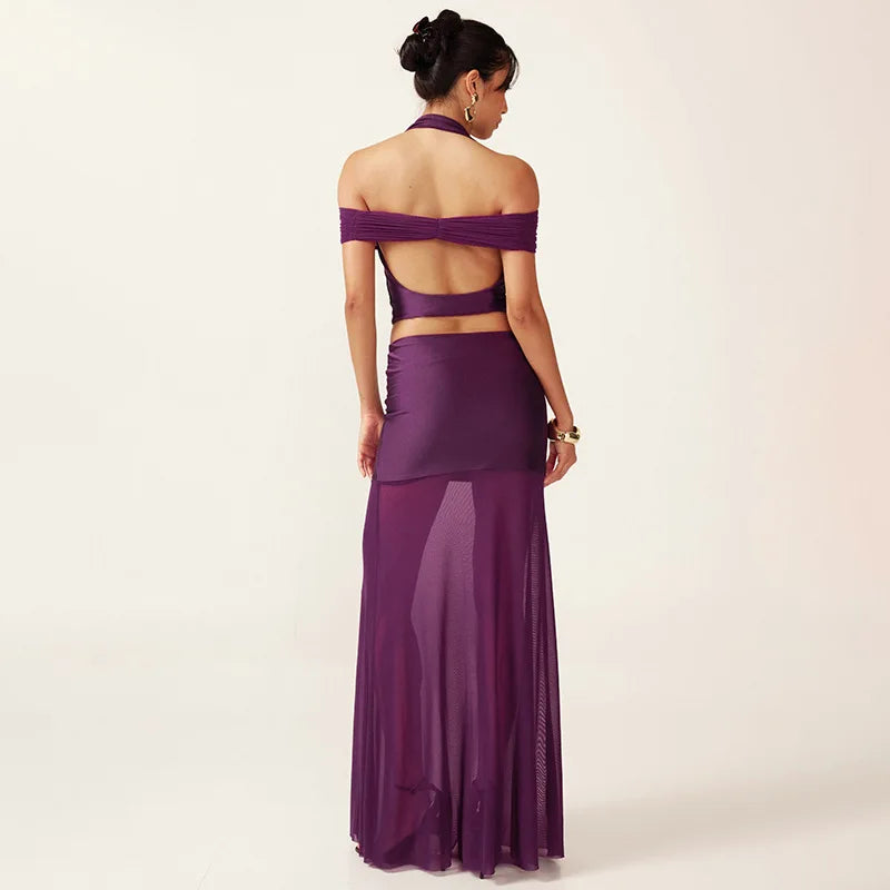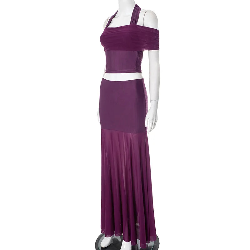 Purple Mesh Two-Piece Set with Sheer Halter Top and Long Skirt