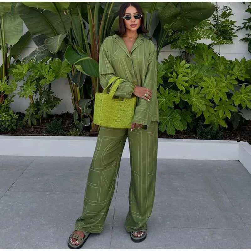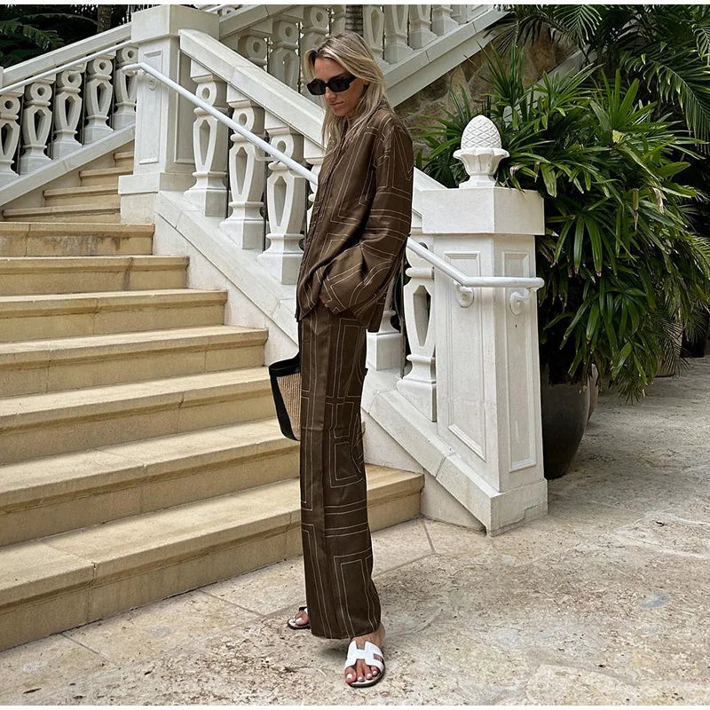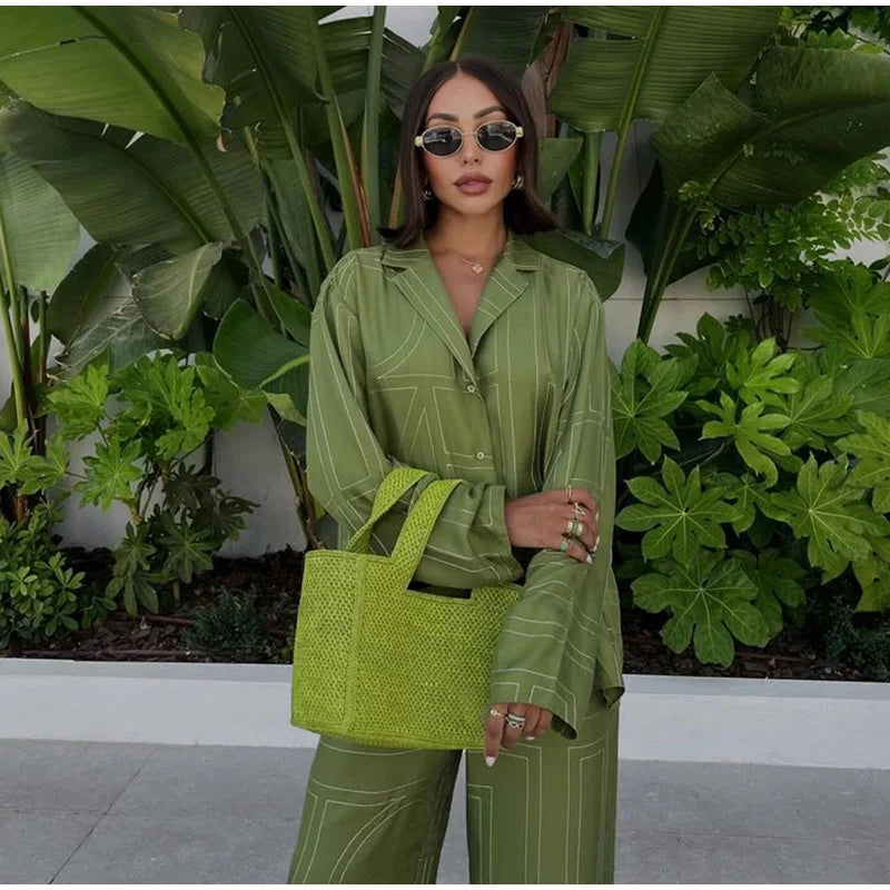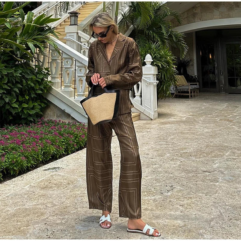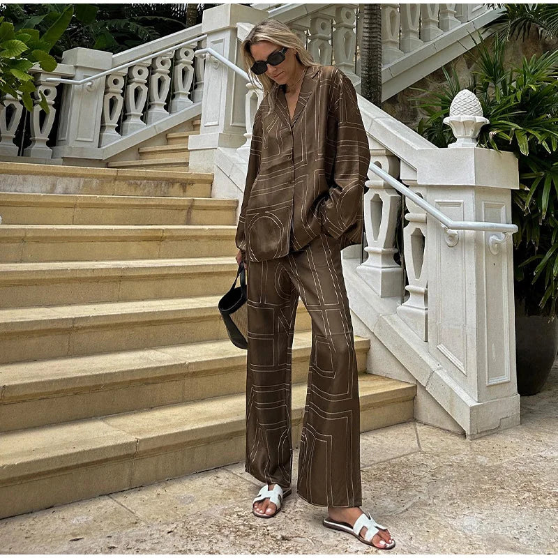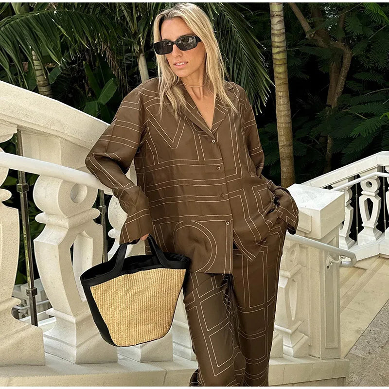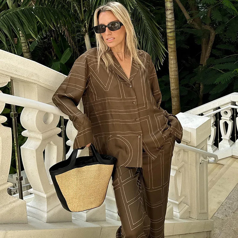Long Sleeved Silk Geometric Shirt High Waist Pant Set