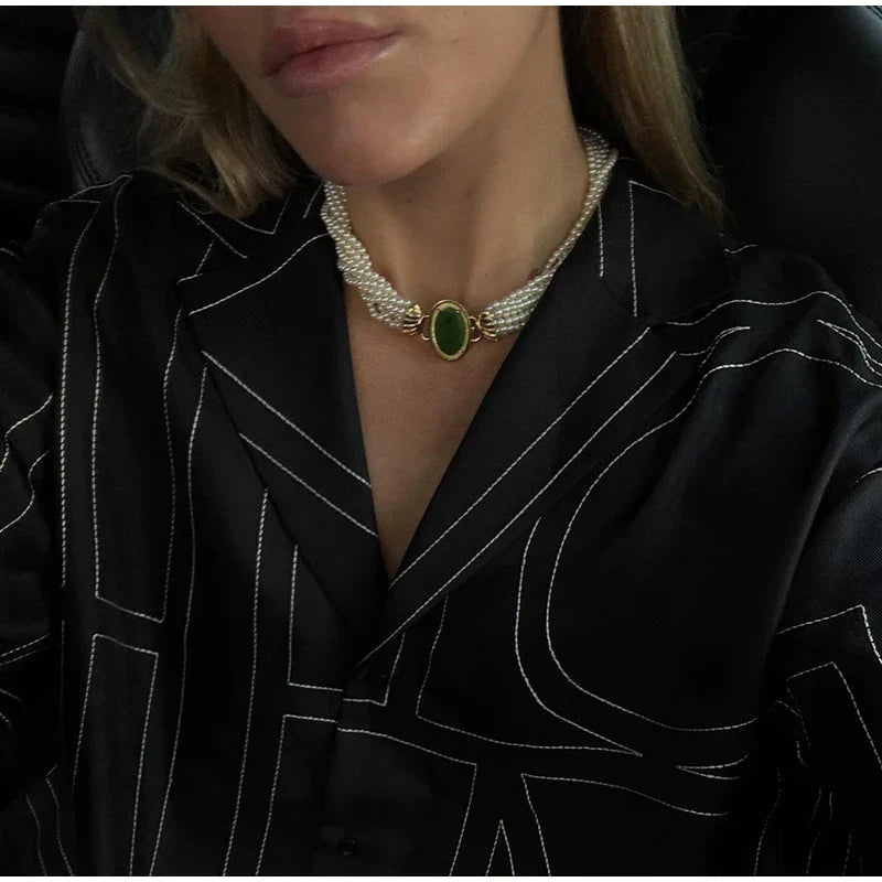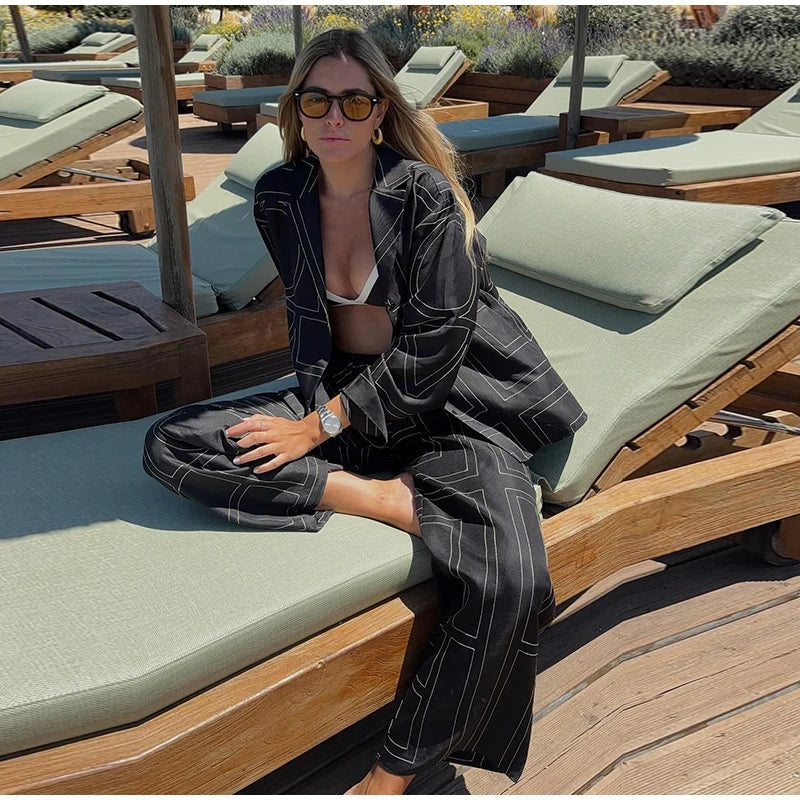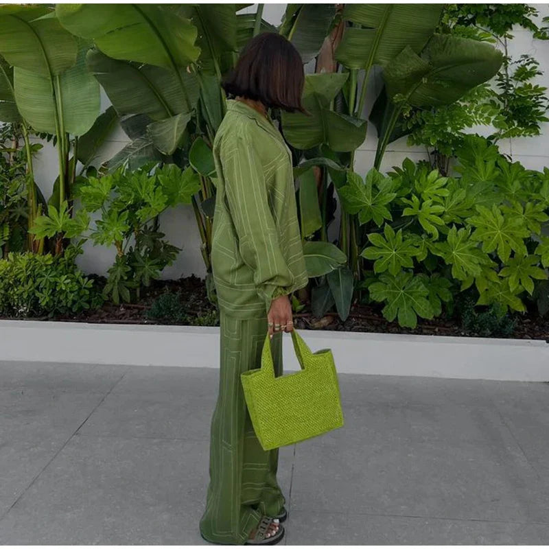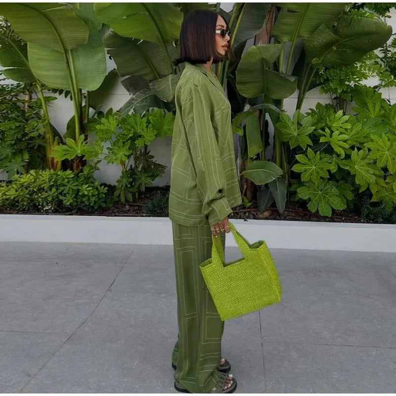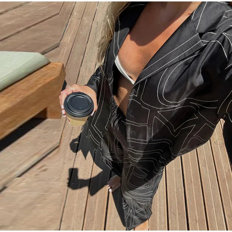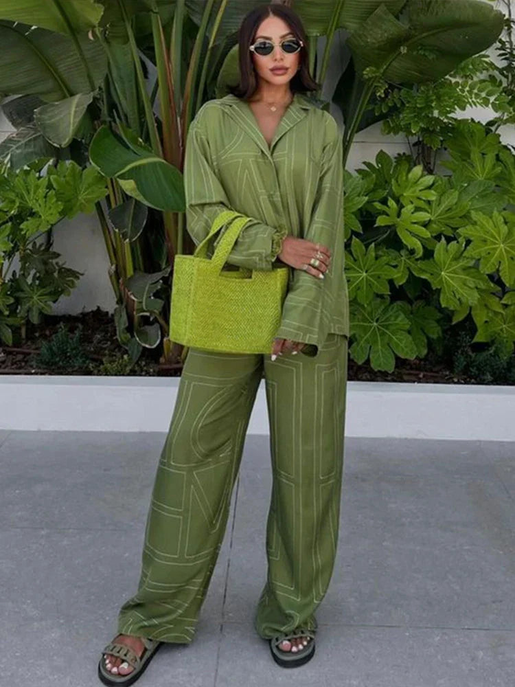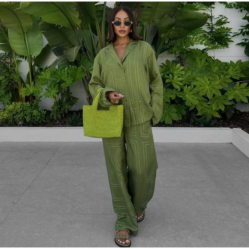 Long Sleeved Silk Geometric Shirt High Waist Pant Set
