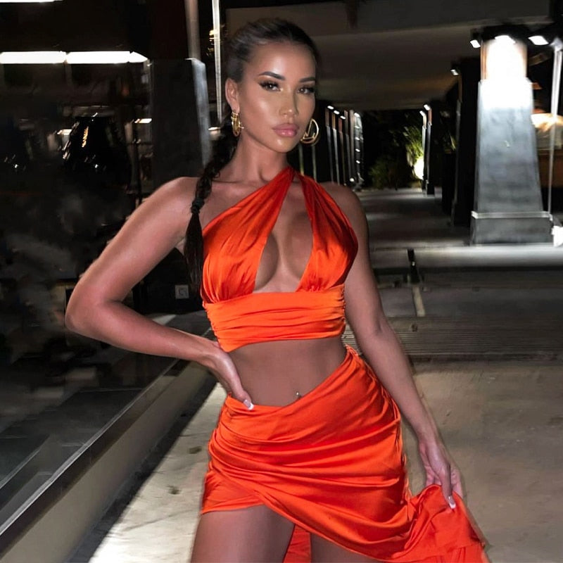 FashionSierra - Satin Backless Crop Top Slit High Waist Skirt 2 Pieces Skirt Set