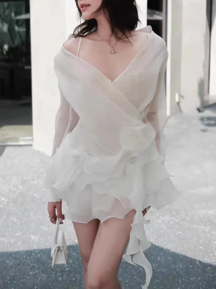 Appliques Ruffles Draped Long Sleeve Dress