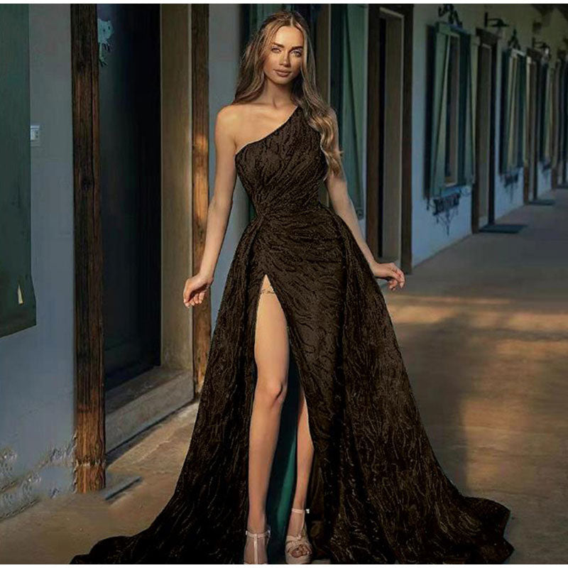 FashionSierra - Sequin Off Shoulder High Split Inclined Shoulder Dress